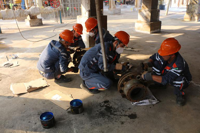 清晨,隨著那一道道身影走出交接班室的大門,橙色的安全帽、手上的工具幾乎成了他們(men) 的標誌。當晨會(hui) 結束,所有人鬥誌昂揚,紛紛走進裝置,全身心地投入到大修中,在裝置中閃現著他們(men) 緊張而又忙碌的身影。