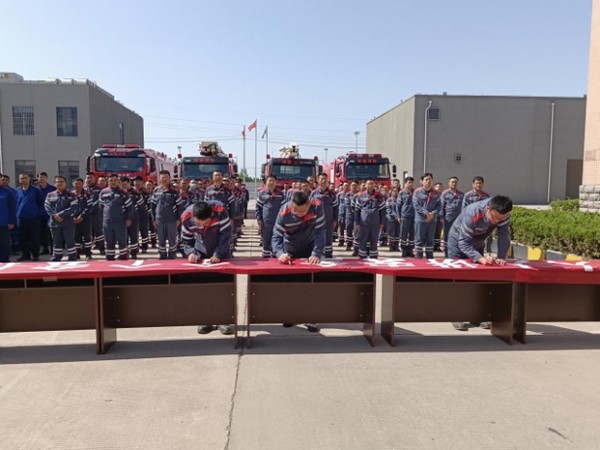 化工公司高中層領導及基層員工代表在安全生產(chan) 月主題橫幅上寫(xie) 下莊嚴(yan) 承諾,以實際行動表明化工公司全員參與(yu) 的安全文化理念,以及人人講安全,個(ge) 個(ge) 會(hui) 應急的信心與(yu) 決(jue) 心。