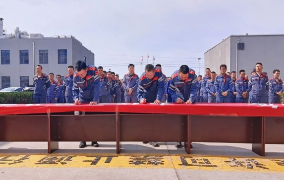 公司總經理、副總經理、安全總監、各部室車間負責人及部分車間職工在“人人講安全、個(ge) 個(ge) 會(hui) 應急——查找身邊安全隱患”橫幅上簽名,篤行安全生產(chan) 、踐行安全承諾。