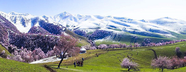 但我們(men) 今天的話題不是經濟也不是美食,而是伊犁的美景,這是最讓我難以忘懷的,伊犁的美真的可以從(cong) 春天一直延伸到冬天。伊犁的春天最讓我念念不忘的是杏花溝,每年的四月上旬至四月底是杏花開的最旺盛的時候,春天初綠的山腰溝穀之間,一樹樹一叢(cong) 叢(cong) 的粉色杏花蔓延開來,既有大氣磅礴的場麵,又有形單影隻的嫵媚,漫步在山間,一陣微風拂過,片片杏花隨著風的吹拂飄過,夾雜著淡淡泥土的芬芳和花香,飄落在坡上、草地上、遊人的頭上,宛如下著一場杏花雨般,分外美麗(li) 。層林盡染的色彩空間,山間牧群的悠閑世界,歡歌流淌的鞏乃斯河與(yu) 銀峰佇(zhu) 立的那拉提大雪山...四月的杏花,帶著春的嬌羞,風的柔美,燦爛的綻放在山間、屋後、坡地上,漂亮極了,這裏的坡有點小陡,像大地上的波浪線一般,呈現在遊人麵前,山坡上到處都是杏樹,層層疊疊,密密麻麻,草地上是青綠色的,杏花粉白,嫣紅,雪上的銀白,各種顏色匯在一起,形成了一個(ge) 五彩斑斕的世界,遠遠望去,那一樹的雪白,渲染著春天的活力,走到近處,每一片花瓣都抹了一絲(si) 胭脂,粉粉嫩嫩的煞是可愛,細細的花蕊呈現出一片燦爛的色彩,讓人感覺到春的溫暖。