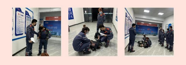 講解完成後,為(wei) 我們(men) 示範了空氣呼吸器的檢查和規範使用。首先檢查背托、束帶、麵屏、導管等設備的完好性;旋轉瓶閥手輪至少兩(liang) 圈,打開瓶閥,表讀數應在28-30MPa之間;關(guan) 閉瓶閥,再看壓力表,指針不動則導管及壓力表氣密性良好;輕壓供氣閥按鈕緩慢排氣,應能聽到警報聲;檢查麵罩氣密性:用手掌心蓋住麵罩口,如感到無法呼吸,表明麵罩氣密性良好;設備完好、氣壓正常、氣密性良好,則可正常使用。然後將瓶閥向下,背上氣瓶,收緊肩帶,扣好腰扣,再收緊腰帶。戴上麵罩,收緊麵罩帶,再次檢查麵罩氣密性。打開氣閥,將供氣閥推入麵罩接口,有“哢嗒”聲,表示已正確連接。深呼吸直至通氣,方為(wei) 正確穿戴。結束後卸下氣閥,摘下麵罩,將腰帶肩帶鬆開。整理好空氣呼吸器。關(guan) 閉閥門,排盡餘(yu) 氣,直至壓力表指針回零。