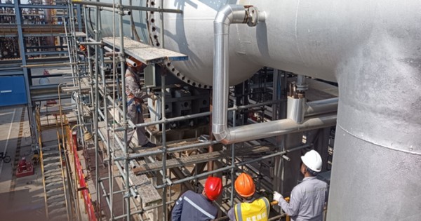 看,那裏有一群身穿藍色“戰袍”的承包商檢修人員,頭頂著烈日,不懼炎熱,穿梭在密密麻麻的管道之間,大大小小的設備身旁,安裝的那麽(me) 嚴(yan) 謹,配合的那麽(me) 自然,忙而不亂(luan) ,井然有序。
