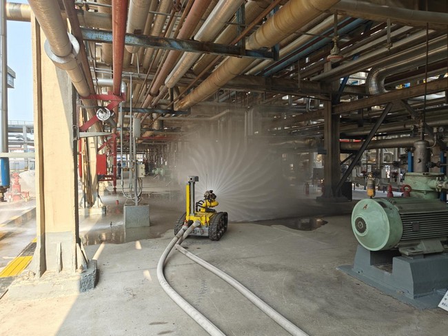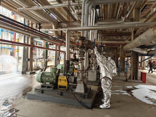 穩汽泵機封噴出“5米高”火柱,現場瞬間告急。班組人員立即投入初期滅火戰鬥,白色幹粉如瀑布般傾(qing) 瀉,與(yu) 烈焰展開交鋒。與(yu) 此同時,安環部、技術設備部等多部門應急小組聞令而動,火速集結至現場指揮部。16時34分,三輛消防車呼嘯而至。經過消防隊員偵(zhen) 查後,3輛消防車組成攻堅矩陣:1號高噴車的消防臂如機械巨蟒伸展至“火區”上空,霧狀水幕包裹灼熱管道;3號車戰鬥員鋪設的第12盤水帶在地麵蜿蜒,水槍手弓步手持“銀盾”抵進;2號車消防坦克機器人噴吐乳白泡沫,如液態綢緞覆蓋火泵。經過10分40秒鏖戰,囂張火舌終被撲滅。