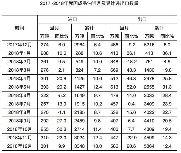 2018年12月份,我國成品油出口586萬(wan) 噸,同比提高20.6%,而上月及上年同期分別下降22.9%和9.2%。2018年1-12月,我國成品油累計出口量為(wei) 5864萬(wan) 噸,同比增長12.4%,增速較2018年1-11月回落1.9個(ge) 百分點,較上年同期提高4.4個(ge) 百分點。