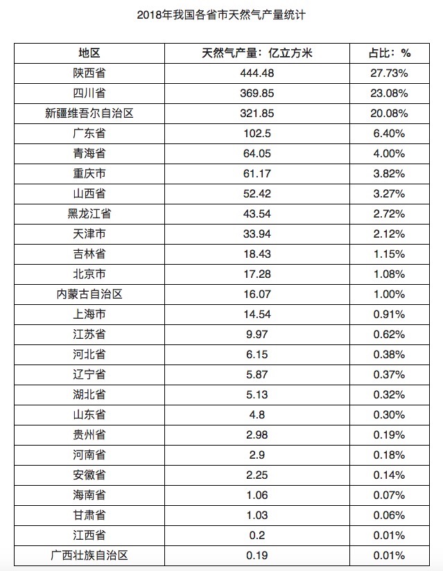 2018年12月我國天然氣產(chan) 量為(wei) 152.5億(yi) 立方米,2018年我國天然氣累計產(chan) 量為(wei) 1602.7億(yi) 立方米。2018年12月我國天然氣產(chan) 量中,排名前六的地區分別是陝西省、四川省、新疆維吾爾自治區、廣東(dong) 省、青海省、重慶市,產(chan) 量分別是41.7億(yi) 立方米、40.4億(yi) 立方米、29.4億(yi) 立方米、10.5億(yi) 立方米、6.1億(yi) 立方米。