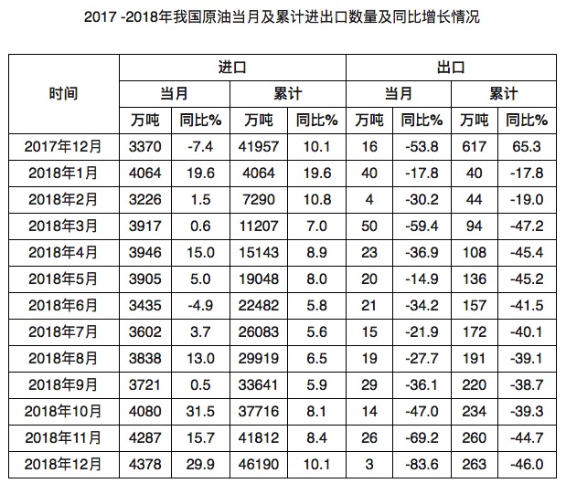 國內(nei) 成品油供大於(yu) 需,但仍需進口。一方麵受國內(nei) 供給端集中檢修影響,地煉開工率高位回落,供給階段性發生緊缺。2018年12月份,我國成品油進口301萬(wan) 噸,同比增長9.9%,增速較上月回落12.1個(ge) 百分點,較上年同期提高3.9個(ge) 百分點。1-12月累計進口3348萬(wan) 噸,同比增長13.0%,增速較上月和上年同期分別提升0.6個(ge) 和6.6個(ge) 百分點。