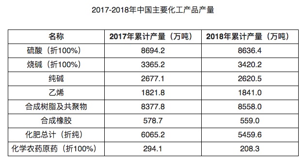 2018年,全國主要化工產(chan) 品總產(chan) 量增幅約2.3%。其中,化肥總產(chan) 量(折純)5459.6萬(wan) 噸,下降5.2%;硫酸產(chan) 量8636.4萬(wan) 噸,增長1.8%;燒堿產(chan) 量3420.2萬(wan) 噸,增長0.9%;乙烯產(chan) 量1841.0萬(wan) 噸,增長1.0%;純苯產(chan) 量827.6萬(wan) 噸,增長4.7%;甲醇產(chan) 量475.6萬(wan) 噸,增長2.9%;合成材料總產(chan) 量1.58億(yi) 噸,增長7.5%;輪胎產(chan) 量8.16億(yi) 條,增幅1.0%。