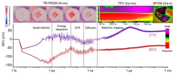 此項研究中,科研人員綜合集成多種可在時空尺度銜接的技術,對光催化劑納米顆粒的光生電荷轉移進行全時空探測,首次在一個(ge) 光催化劑顆粒中跟蹤了電子和空穴到表麵反應中心的整個(ge) 機製。他們(men) 還明確了電荷分離機製與(yu) 光催化分解水效率之間的本質關(guan) 聯。