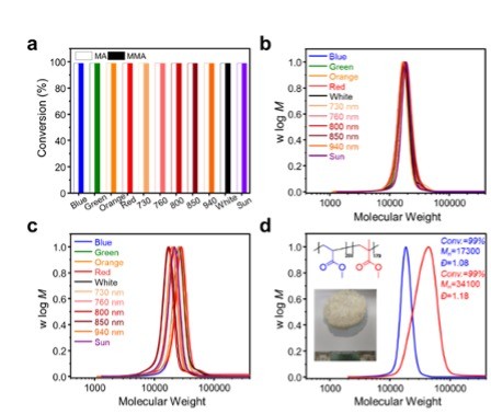 實驗數據表明,該成果可在波長450至940納米範圍內(nei) 進行高效光催化聚合,覆蓋了從(cong) 藍光到紅外光波段,所需光強低,且不受多雲(yun) 等天氣影響。該成果具有超高光催化效率,多種單體(ti) 轉化率超99%。聚合物分子量可控,結構控製性能優(you) 異,可合成多種特種高分子材料。